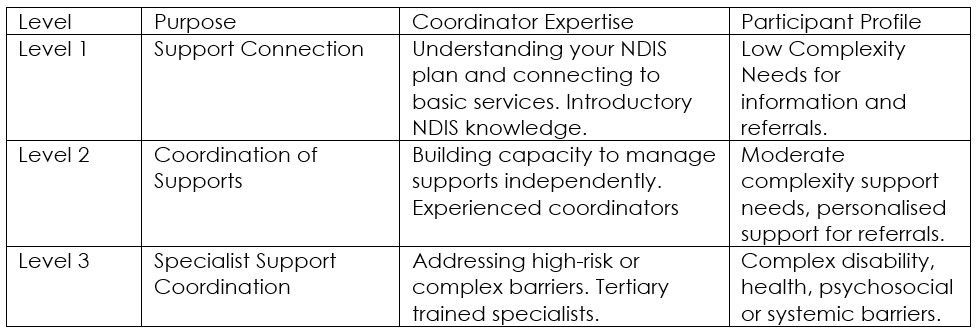 In essence, Level 2 Coordination of Supports builds capacity, while Specialist Support Coordination restores stability. Where Level 2 coordination is proactive and developmental, SSC is intensive, clinically informed, and solution-oriented, ensuring that participants with the highest complexity are not left to navigate fragmented systems alone.
